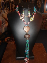 |  Collier C6-051Prix: 45,00 € Collier festif original à base de pâtes de verre ovales et plates de plusieurs couleurs vives à tendance turquoise, de perles rikkiki, et d'une boule d'ambre foncé... Très long, il peut être associé... Suite... |