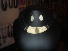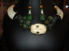 |  Collier C6-047Prix: 35,00 € Collier en corne de phacochère sur ses contours, de la résine en forme de grappe de raisins, de l'os de chameau, des petites perles de Bogolan... Suite... |