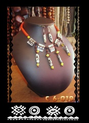 Collier C6-019Prix: 35,00 € Collier mystique avec des pendants!!! Ses os de chameau teintés en "Bogolan" sont de tailles et formes diverses ajuster de façon harmonieuse auxquels les "Koffyn" rouges donnent une dimension... Suite... |