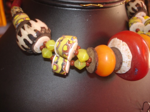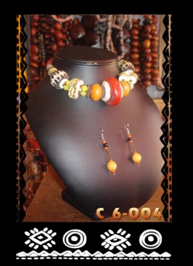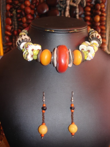 Bienvenue dans le monde des bijoux africains Collier C6-004 | Joli collier à base d'ambre, de perles de "Bogolan" et rehaussé de perles de "millefleurie" à tendance jaune. Vendu avec sa paire de boucles d'oreille" Longeur: 19 cm
