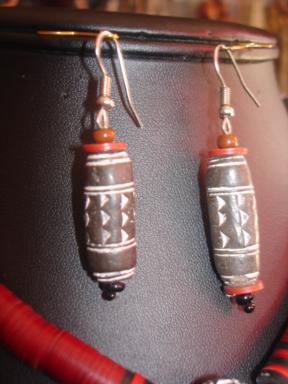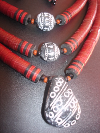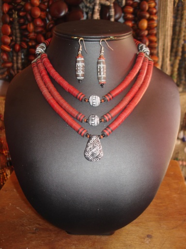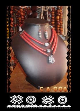 Collier C6-006 | Elégants colliers superposés ne faisant q'un seul, se compose simplement de rondelles de "Koffyn" rouge(perles de rondelles de plastiques) et de perles de terre cuite noires petites et grandes .Il ravira votre échancrure et mettra en valeur votre décolleté. Vendu avec sa paire de boucles d'oreille" Longeur: 26 cm