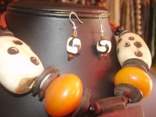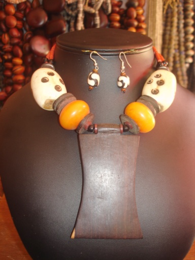 Collier C6-007 | collier africain à caractère ethnique fort grâce à son médaillon central fait à base de bois d'ébène allié à l'os de chameau et rehaussé d'éclat par l'intensité de l'ambre. Vendu avec sa paire de boucles d'oreille" Longeur: 27 cm