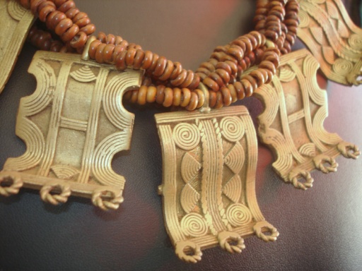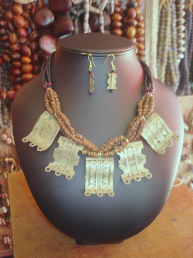 Collier C6-015 | Porté lors de cérémonies diverses avec le boubou de pagne local, ce collier magnifique se veut traditionnel et élégant. Il rassemble les "Koffyn"(rondelles de plastiques) noires ajouté aux graines de café sauvages et un assortiment de poids "Baoulé"(une des grandes ethnies de côte d'ivoire) en bronze. Vendu avec sa paire de boucles d'oreille Longueur: 25 cm