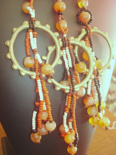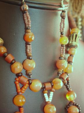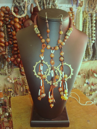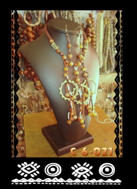 Collier C6-021 | Elégant et original collier s'articulant autour de cerceaux de bronze mêlant et entremêlant des "Koffyn" marrons ainsi que des Agathes, réajusté de perles de verre rouges, blanches et noires. Vendu avec sa paire de boucles d'oreille Longueur: 33 cm