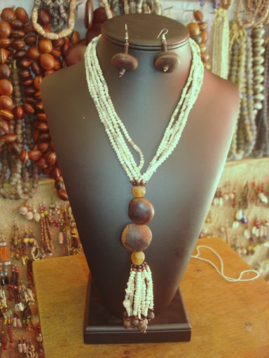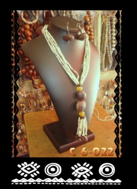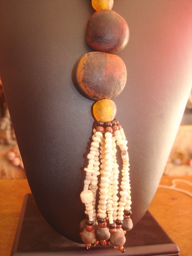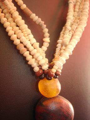 Ce collier authentique allie les perles en terre cuite du Niger, les pâtes de verre du Ghana et les toupies rondes de Côte d'Ivoire