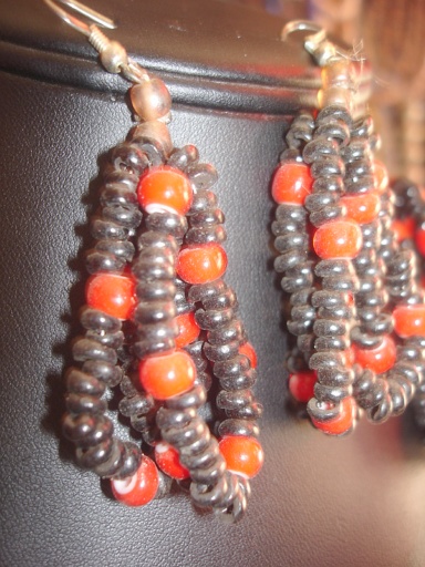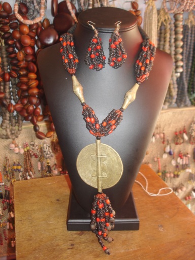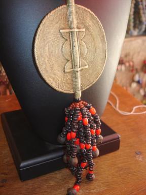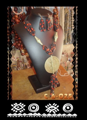 Collier C6-025 | Ce collier pendentif fait parti de la gamme des colliers en graines de café sauvages. A l'encontre des précédents, ses graines de café sont noires et mixées avec des pâtes de verre rouges apportant un côté ethnique fort par la présence de ces deux couleurs fétiches africaines. La médaille" tonnière" en bronze ainsi que les tiges réhaussent cette sensation. Longueur: 19 cm