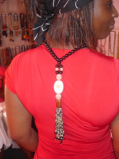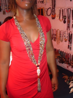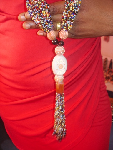 Collier C6-026 | Très long collier de petites perles multicolores à deux facettes (devant/derrière, voir photos).Se porte généralement avec un "maxi"(boubou +jupe droite sexy).Il égayera votre silhouette. A ne pas râter!!! vendu avec sa boucle d'oreille longueur: environ 50 cm