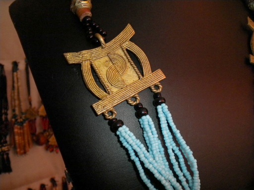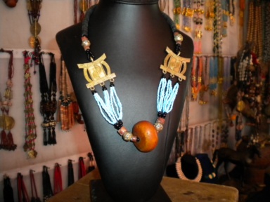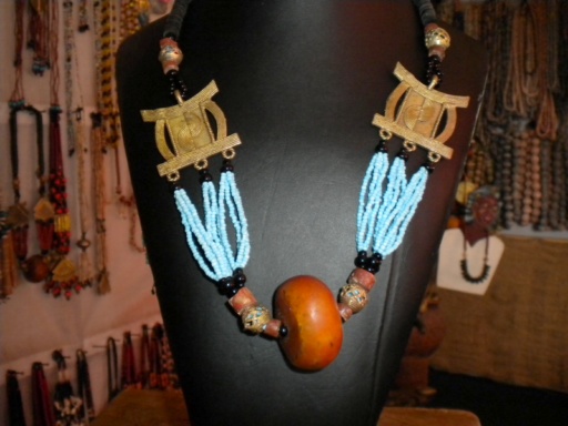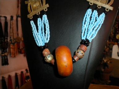 Collier C6-061 | collier utilisant en son centre de l'ambre "Peul" et sur les côtés de grands tam-tam de bronze rehaussé par de petites perles bleues. Simplissime!