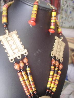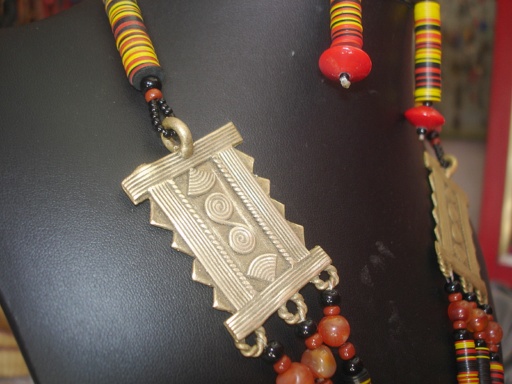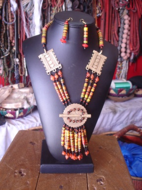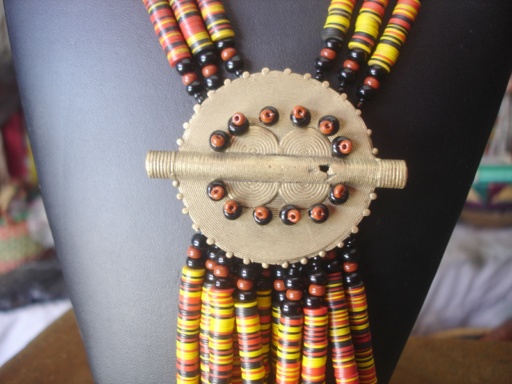 Collier C6-058 | Resplendissant collier de koffyn rouges et jaunes alternés avec des bronzes notamment un bronze central en forme de soleil donnant toute sa dimension à ce long collier.