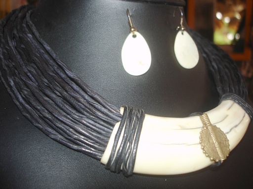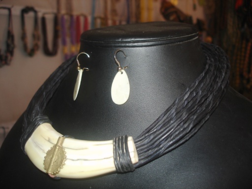 Collier superbement ethnique, fait de tresses de cuir et d'os. A apprécier et essayer!!!