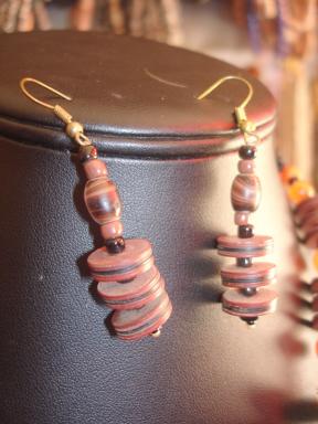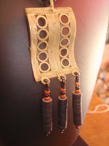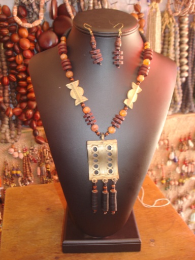 Collier C6-028 | Superbe collier de déesse orné de petites agaathes avec des bronzes divers notamment un bronze central en forme de vague. il s'appuie sur une succession de koffyn marrons superposés . Superbement ethnique!!! dimension :28 cm vendu avec sa paire de boucles d'oreille