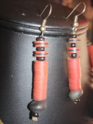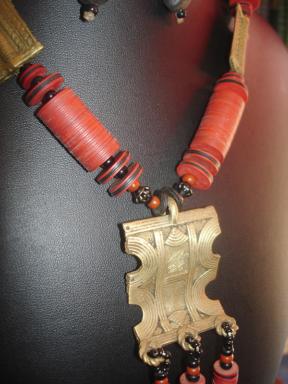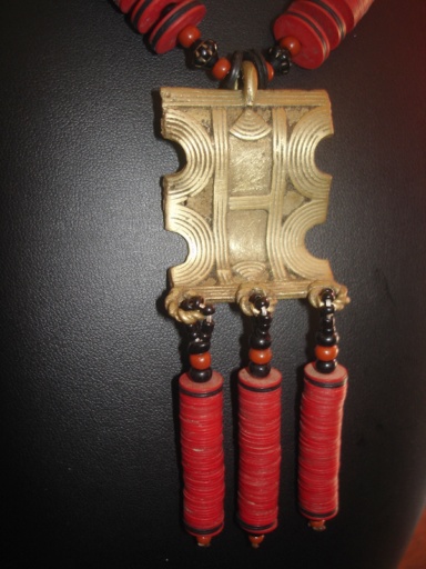 Collier C6-030 | Ce collier allie les couleurs précieuses impériales africaines : rouge et or. Il se caractérise par un ras de cou allongé d'un pendentif en bronze orné de petits pendants de koffyn rouges. dimension :28cm vendu avec sa paire de boucles d'oreille