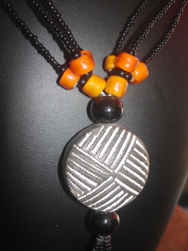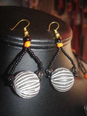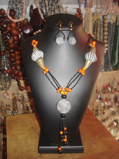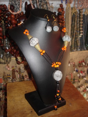 Collier C6-032 | Le Burkina est à l'honneur avec ce collier de perles de terre cuite provenant du Faso : noires et striées de blanc. Elles sont uniques et originales! rehaussé de chapeaux en bronze. dimension : 36 cm Vendu avec sa paire de boucles d'oreille