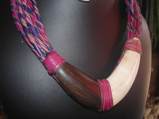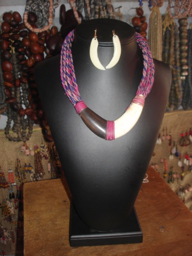 Bienvenue dans le monde des bijoux africains Collier C6-033 | Collier de tresses de cuirs avec de la corne de phacochère en arc de cercle. Simplement hippie chic africain!!!! dimension : 25 cm vendu avec sa paire de boucles d'oreille