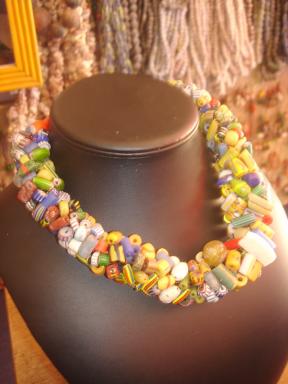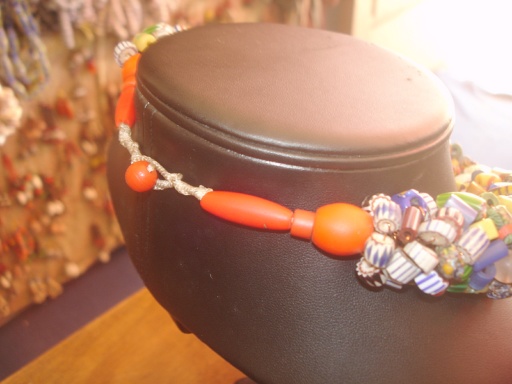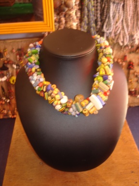 Collier C6-035 | Mélange harmonieux de "Gueshi" ( pâtes de verre du Ghana) donnant naissance à un splendide et unique ras de cou coloré. Il vous sublimera par son originalité et sa rondeur digne de la sphère africaine. Dimension : 24cm Vendu avec sa paire de boucles d'oreille (non visible sur la photo) Provenance : Côte d'Ivoire. |