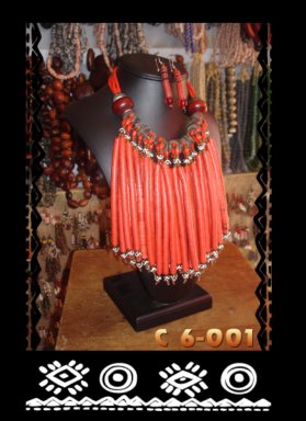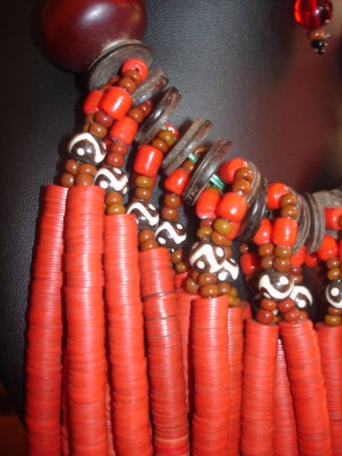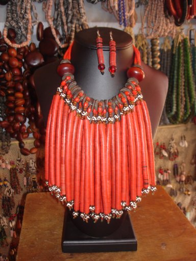Collier C6-001 | Somptueux collier cérémonial à l'image des femmes Masaï du kenya.Il se compose de "koffyn" rouges(perles de plastic en forme de rondelles) et de perles de bogolan. Vendu avec sa paire de boucles d'oreille" Longeur: 32 cm